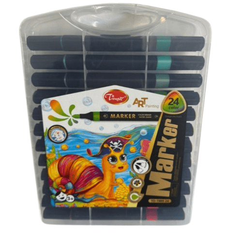 The Tongdi Black Art Painting Marker Set (24 Colors) is a premium selection of richly pigmented markers designed to bring every creative vision to life. Perfect for artists, designers, students, and hobbyists, these dual-tip markers allow for both fine detailing and broad coloring strokes. The water-based, non-toxic ink provides smooth, consistent color with minimal bleed, ensuring clean and professional results. The black-bodied markers come neatly arranged in a sturdy, transparent carry case for easy storage and portability. Featuring a playful underwater pirate-themed design on the packaging, this set combines fun and function—making it ideal for school, art studios, or personal creative projects.